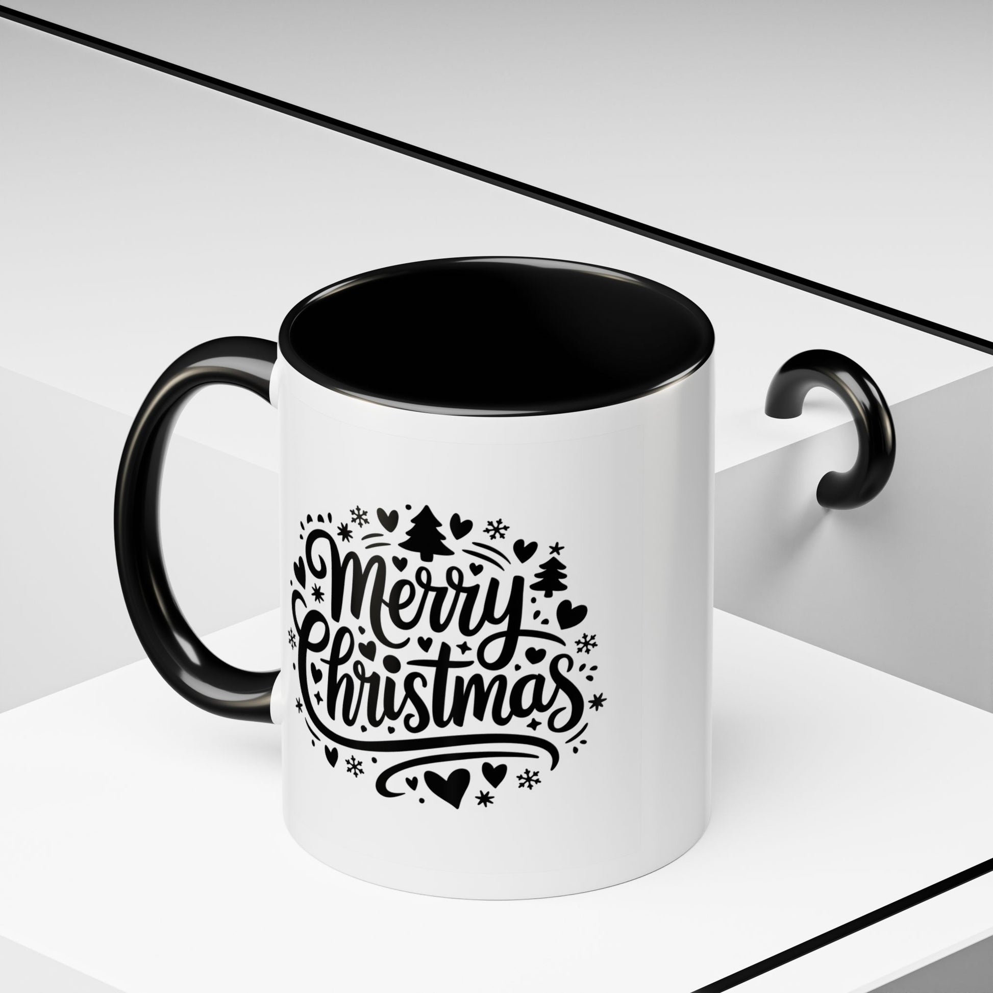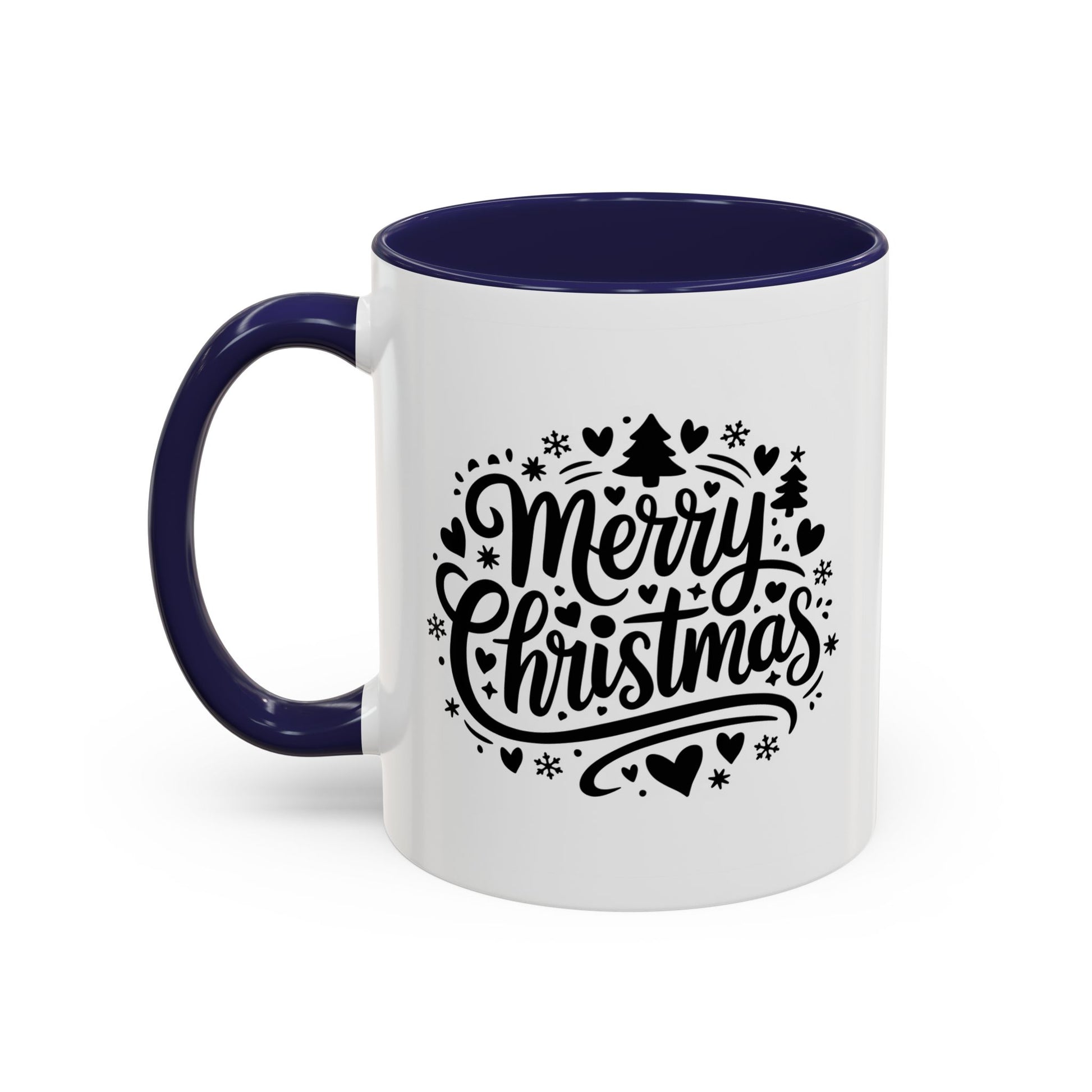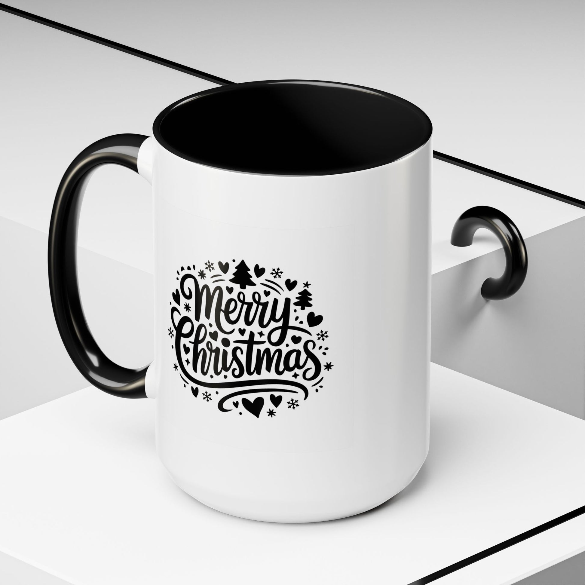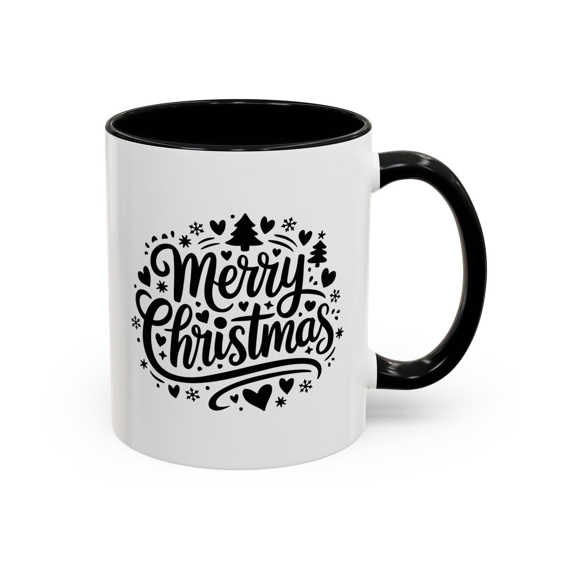 Christmas Mug - Merry Christmas Black Text Trees Snowflakes Hearts