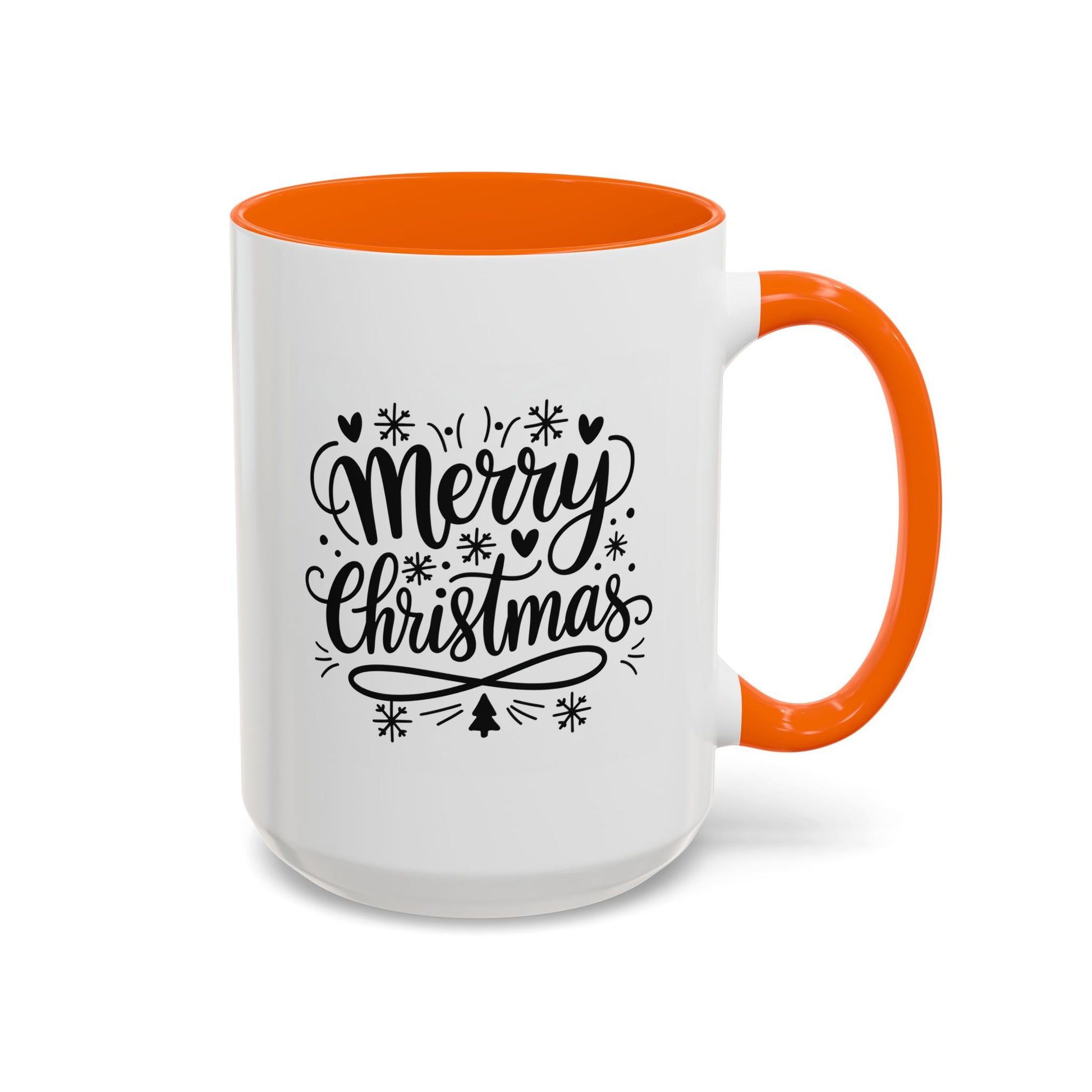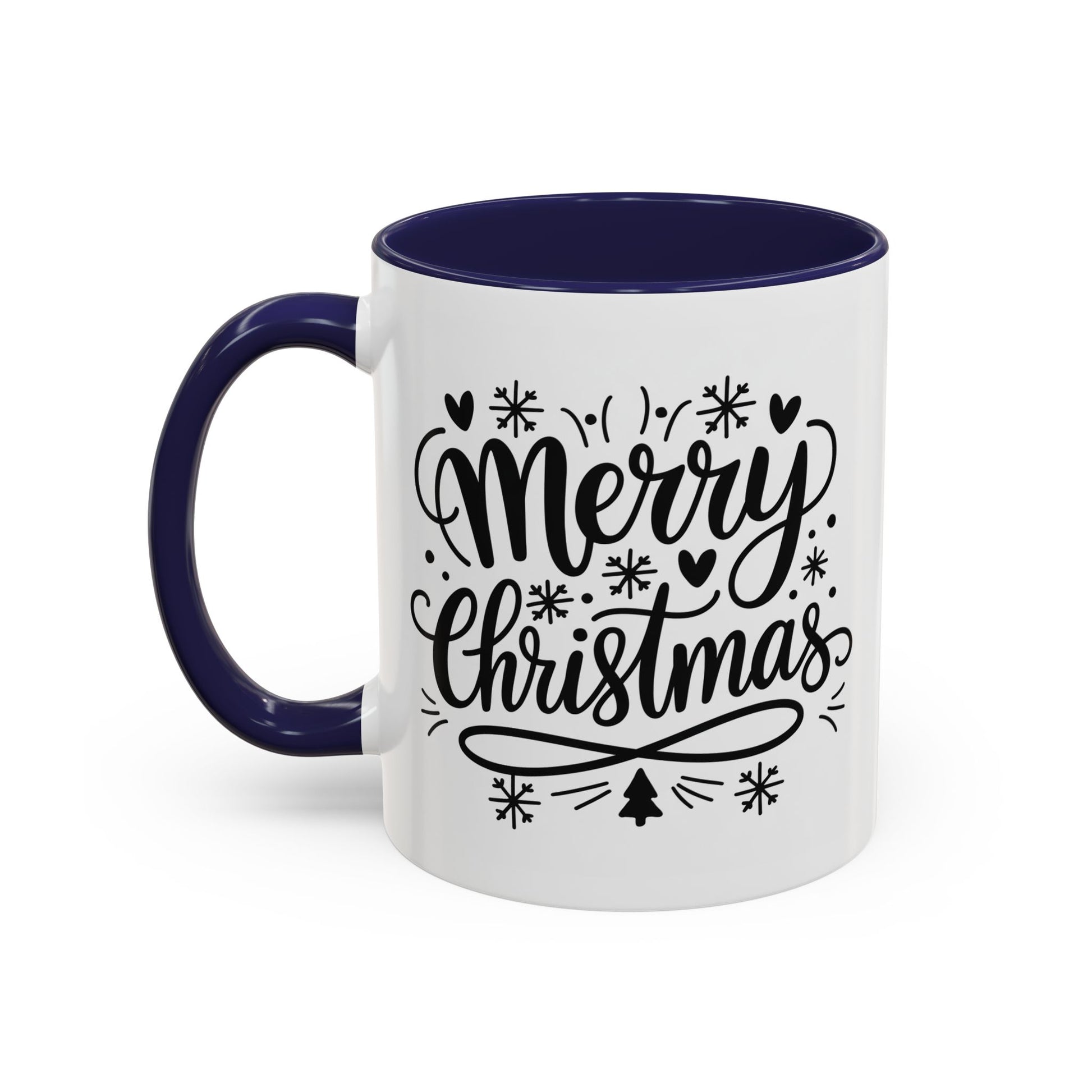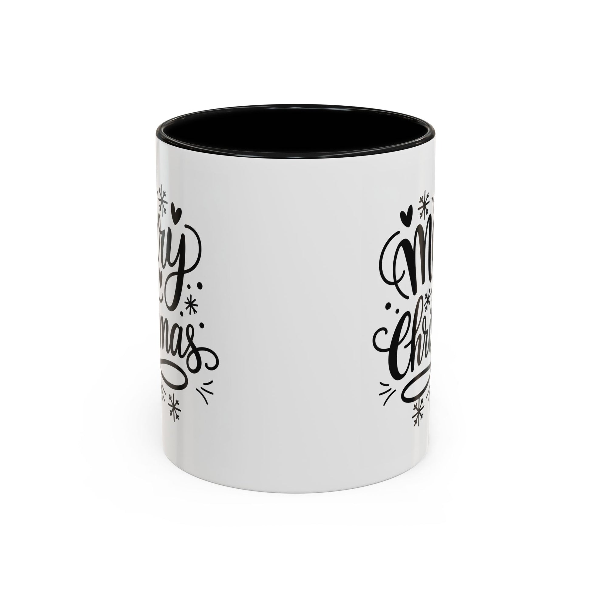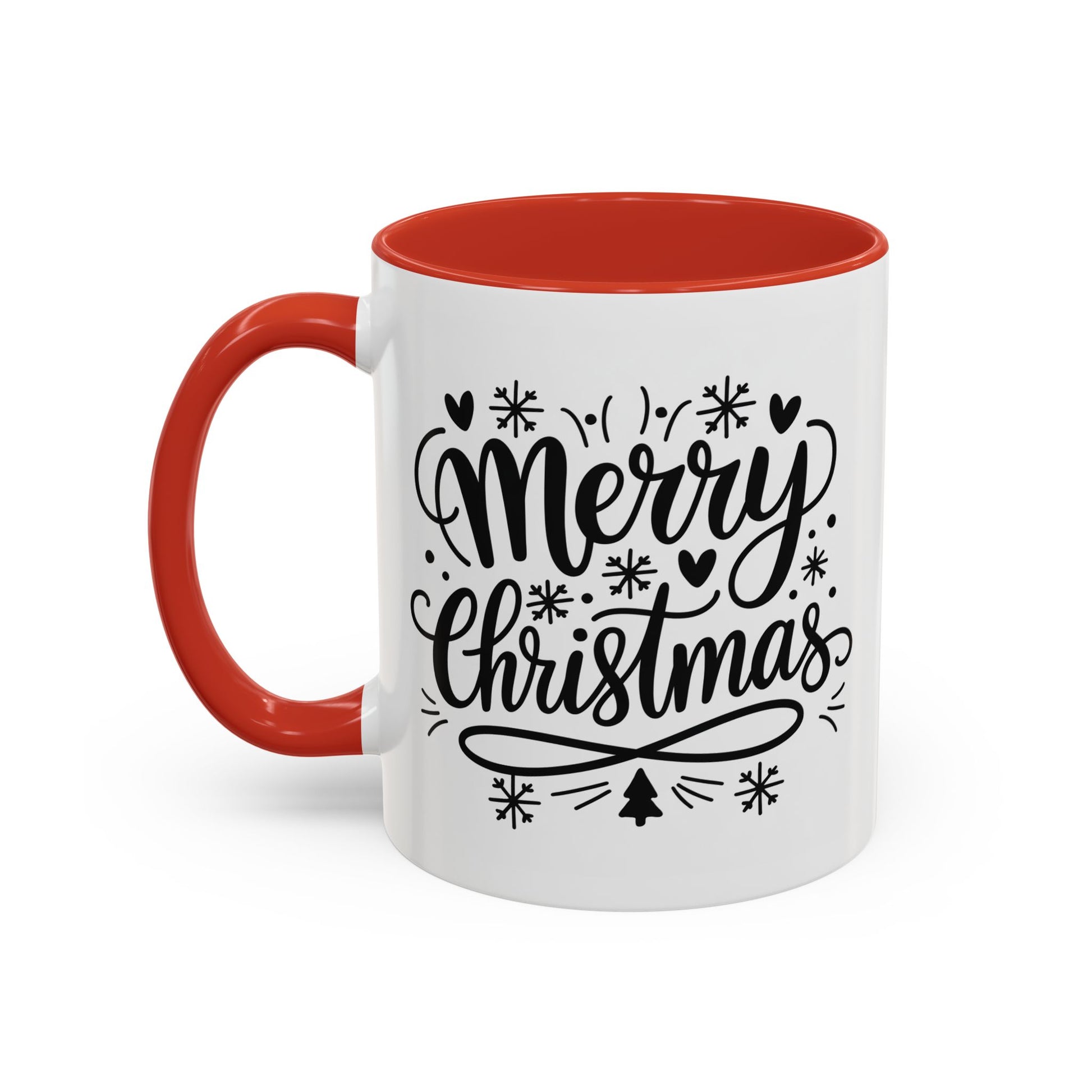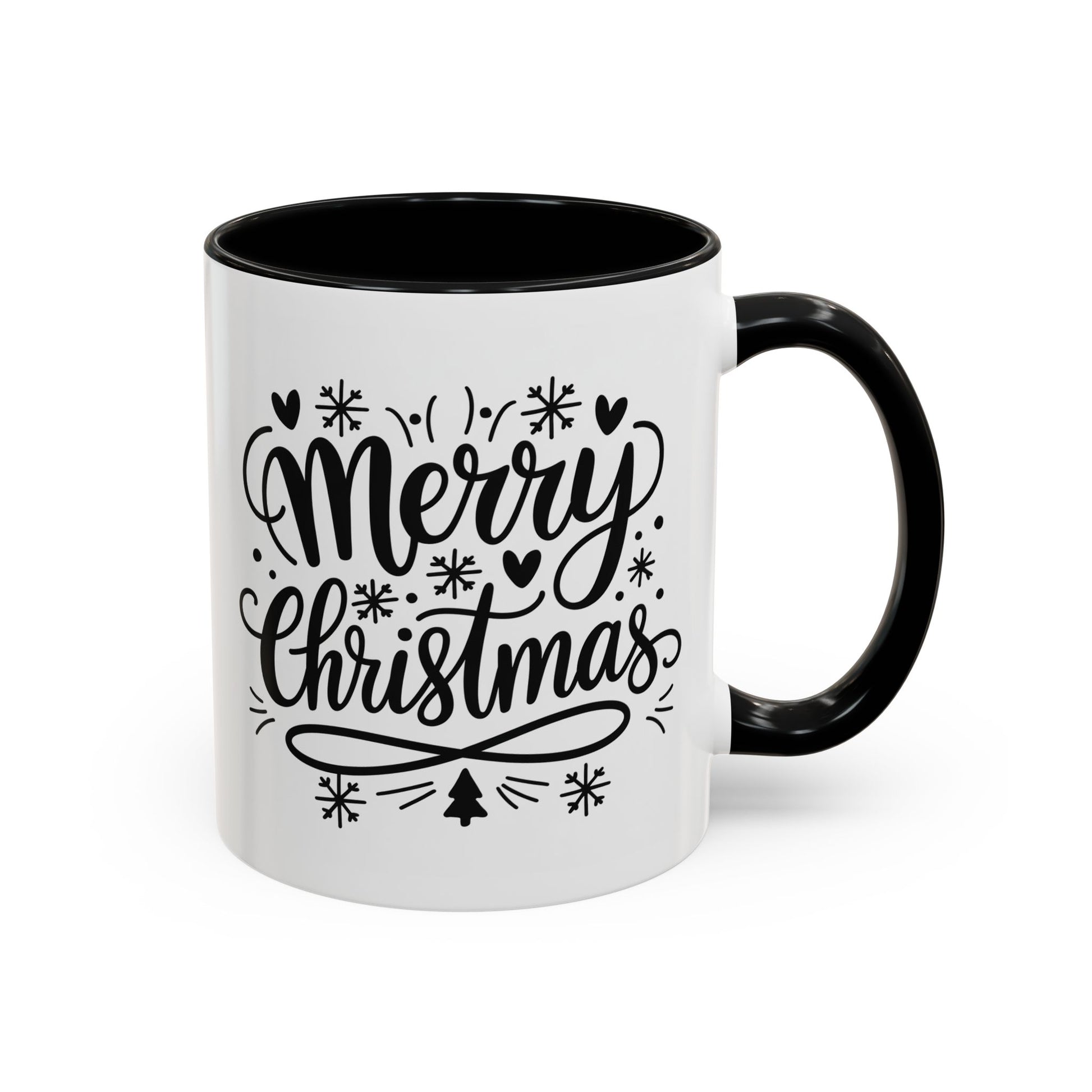 Christmas Mug - Merry Christmas Black Text Tree Snowflakes Hearts