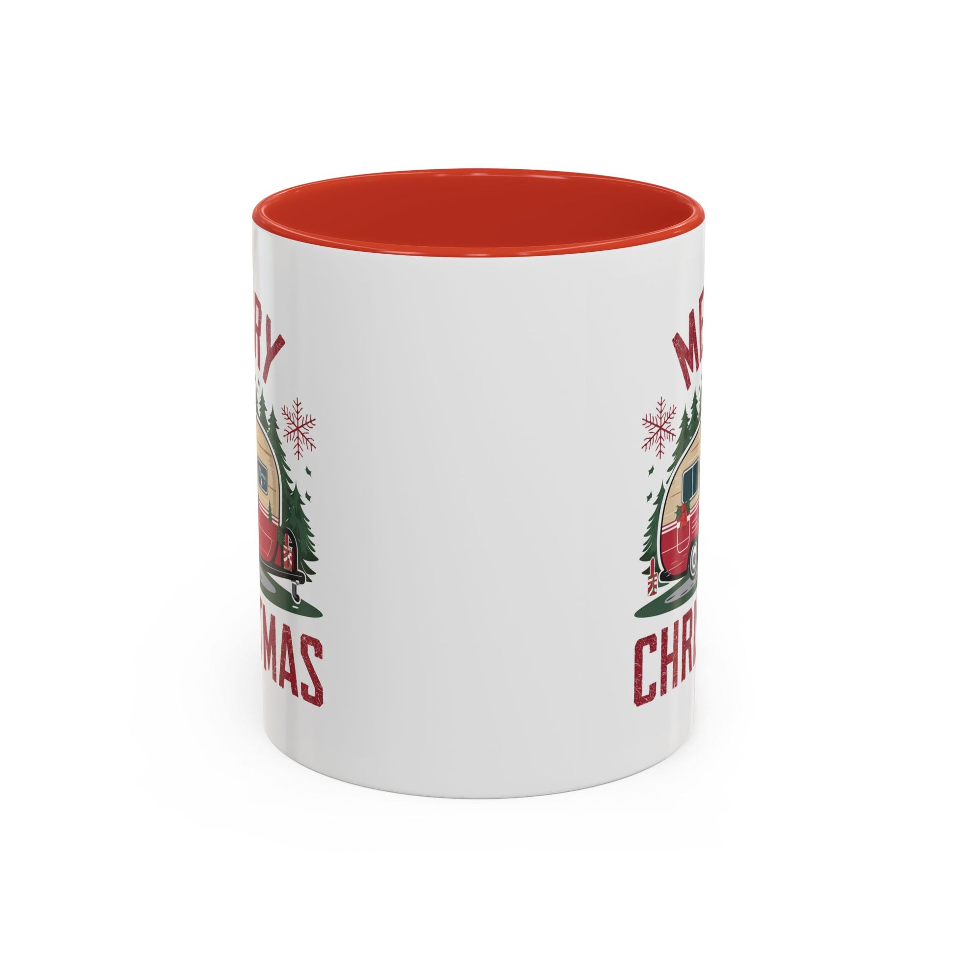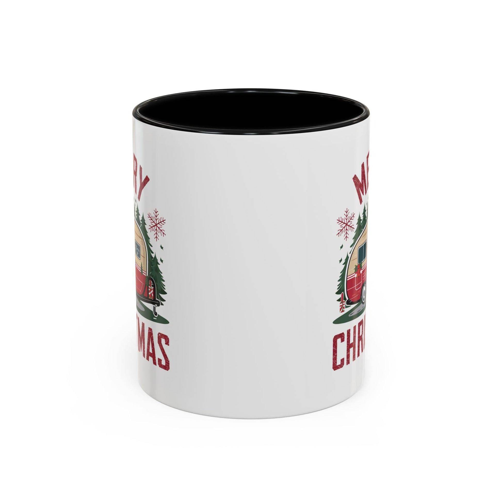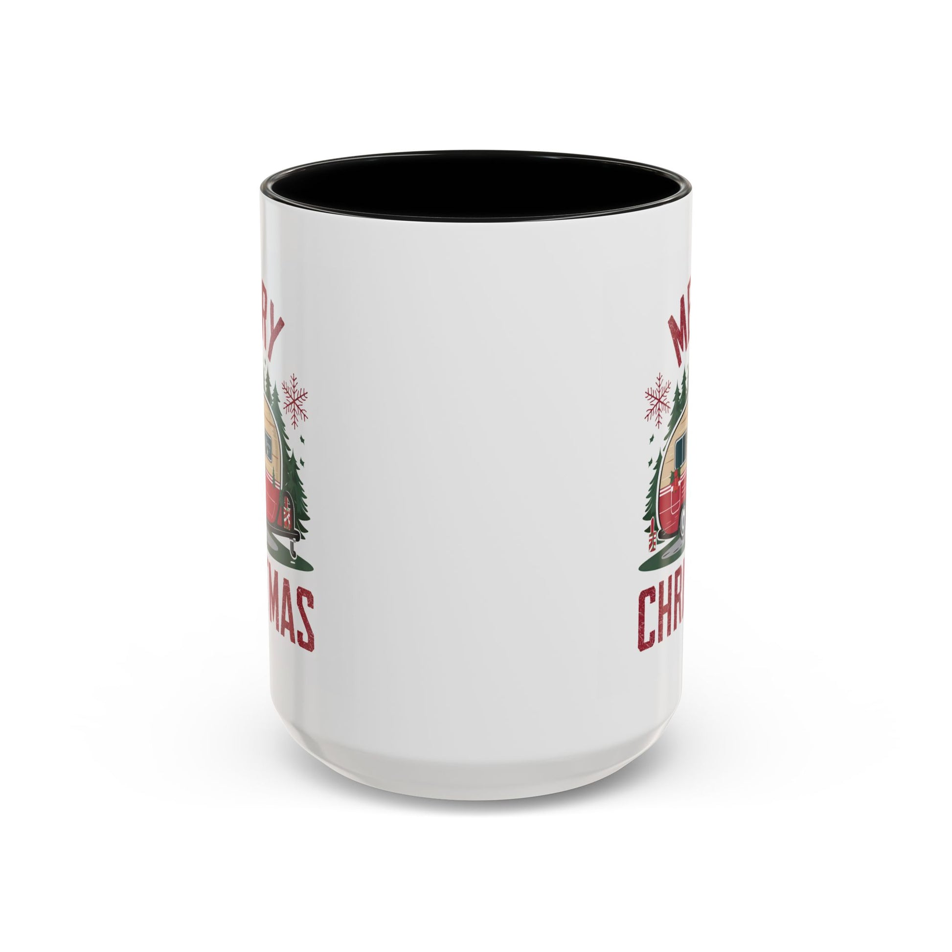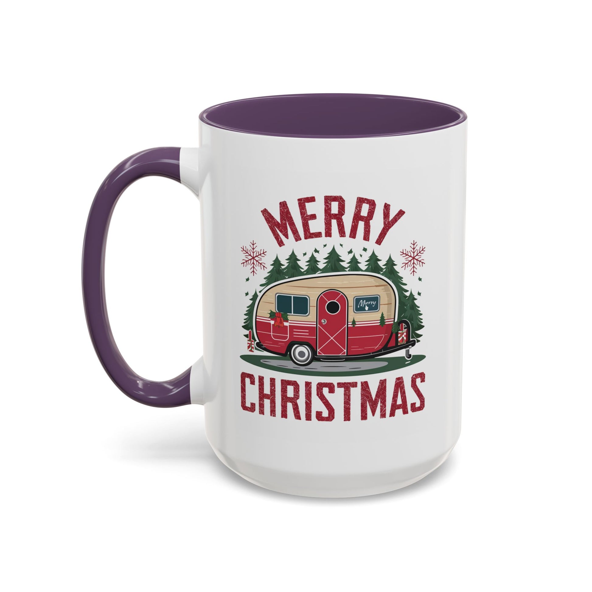 Christmas Mug - Merry Christmas Maroon Text Camper Trees Snowflakes