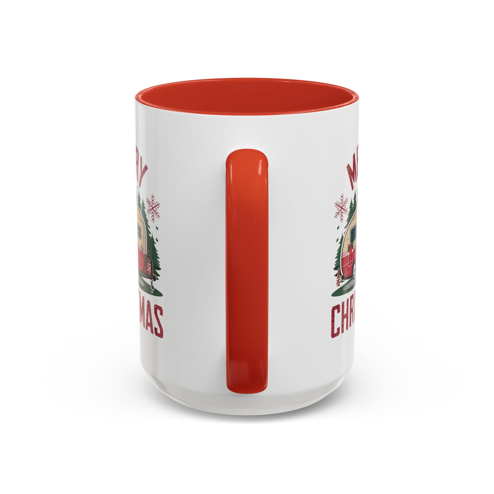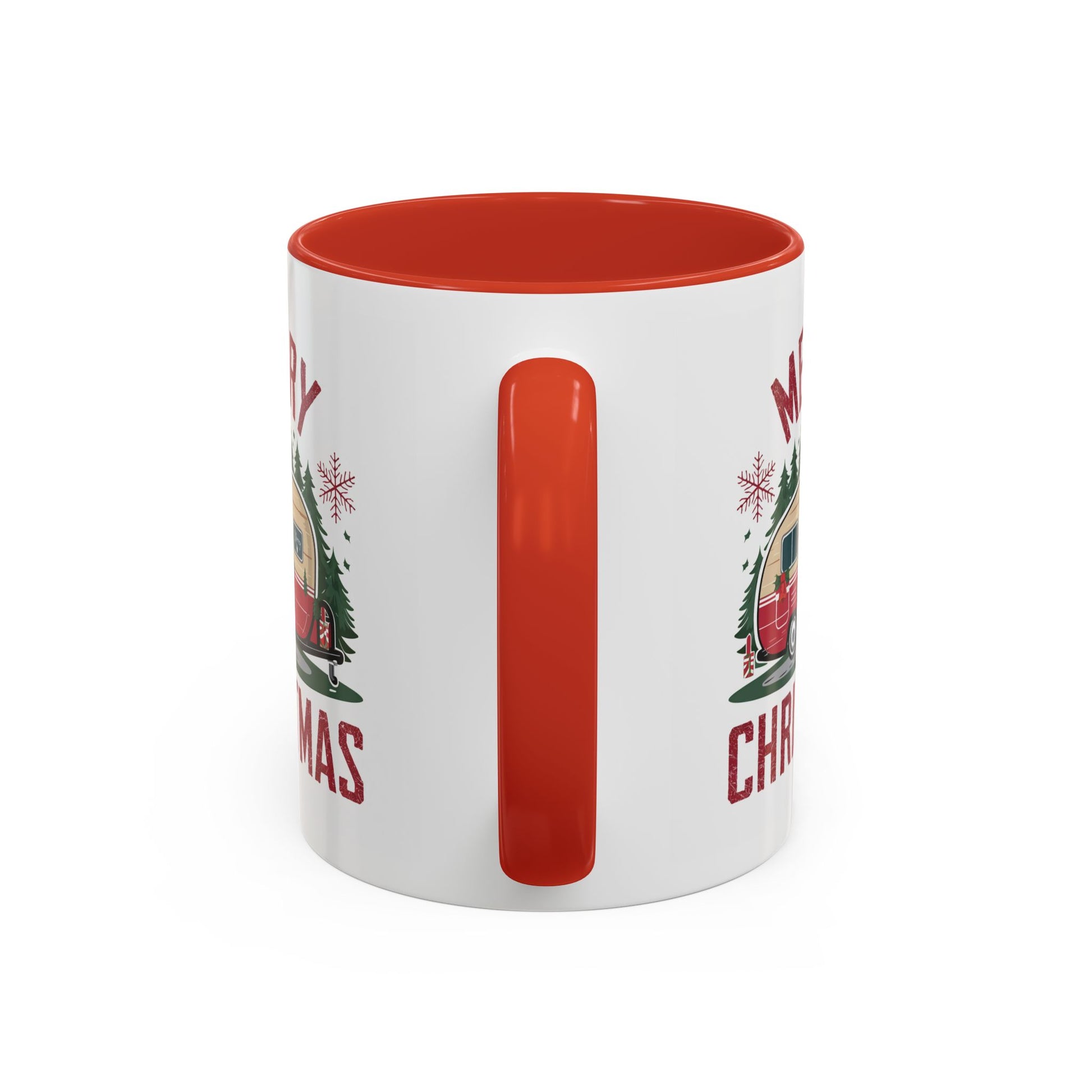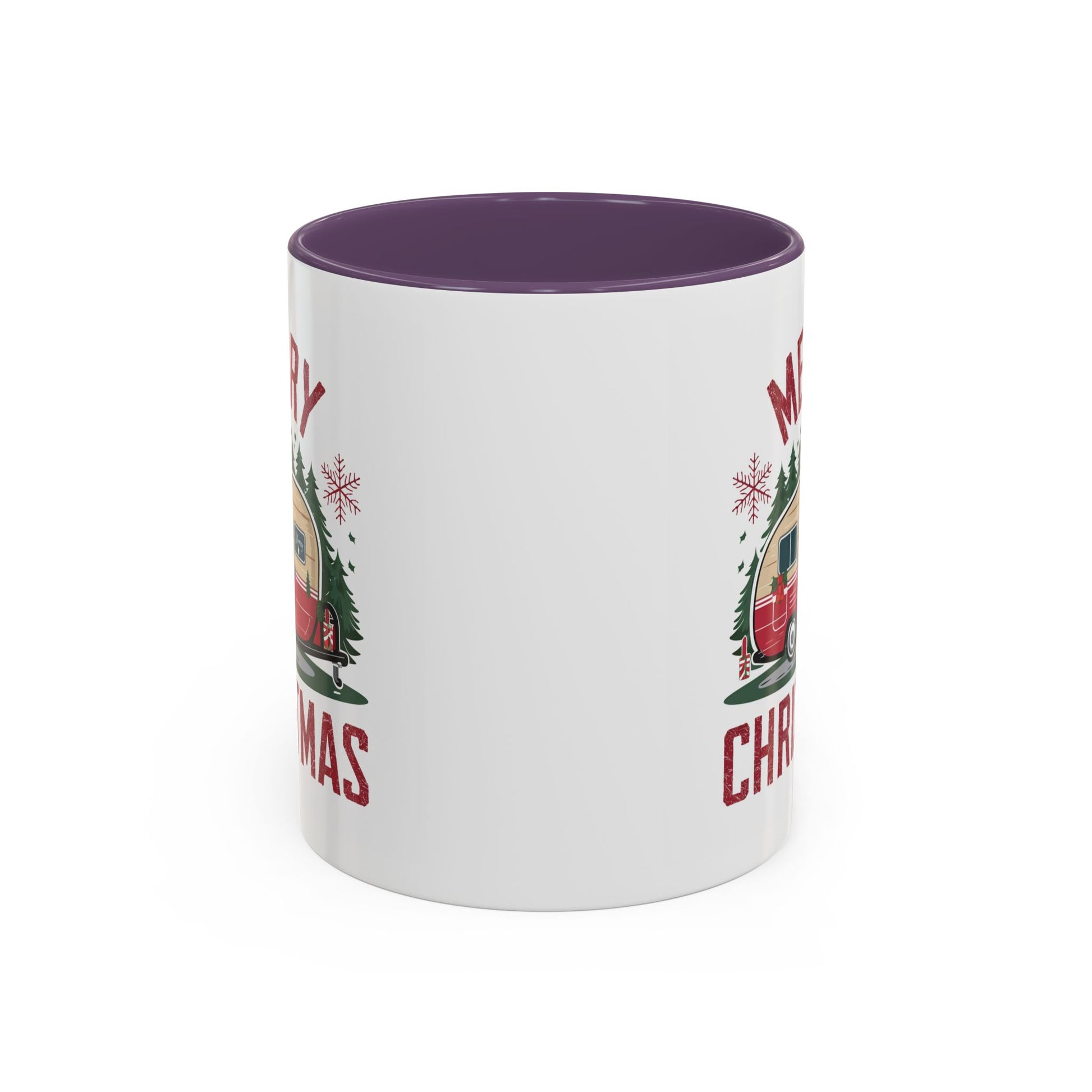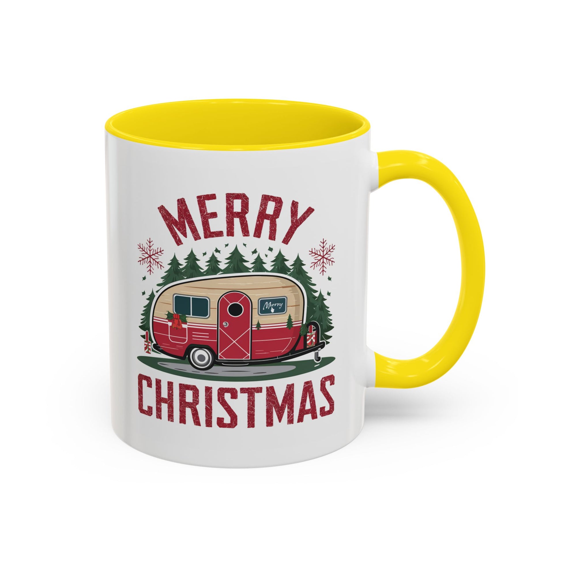 Christmas Mug - Merry Christmas Maroon Text Camper Trees Snowflakes