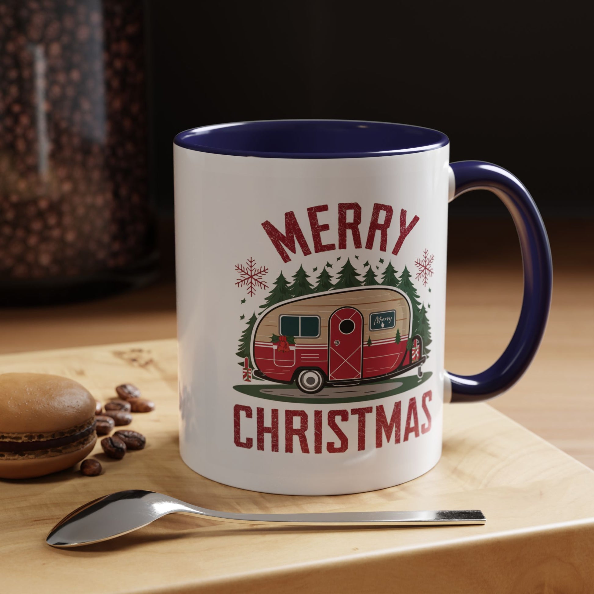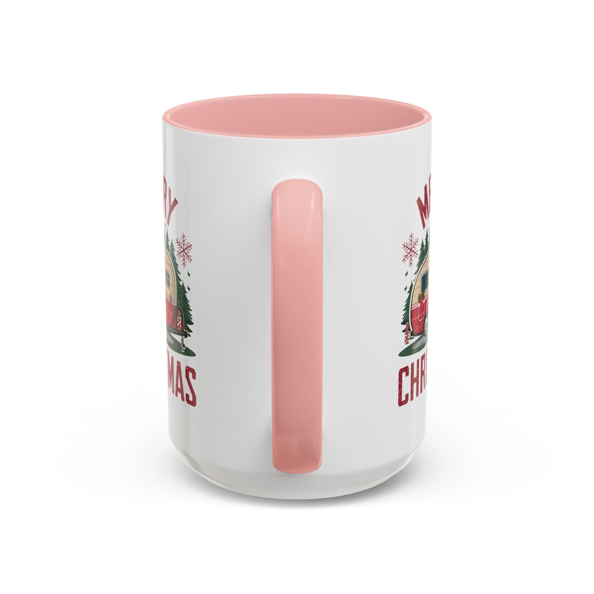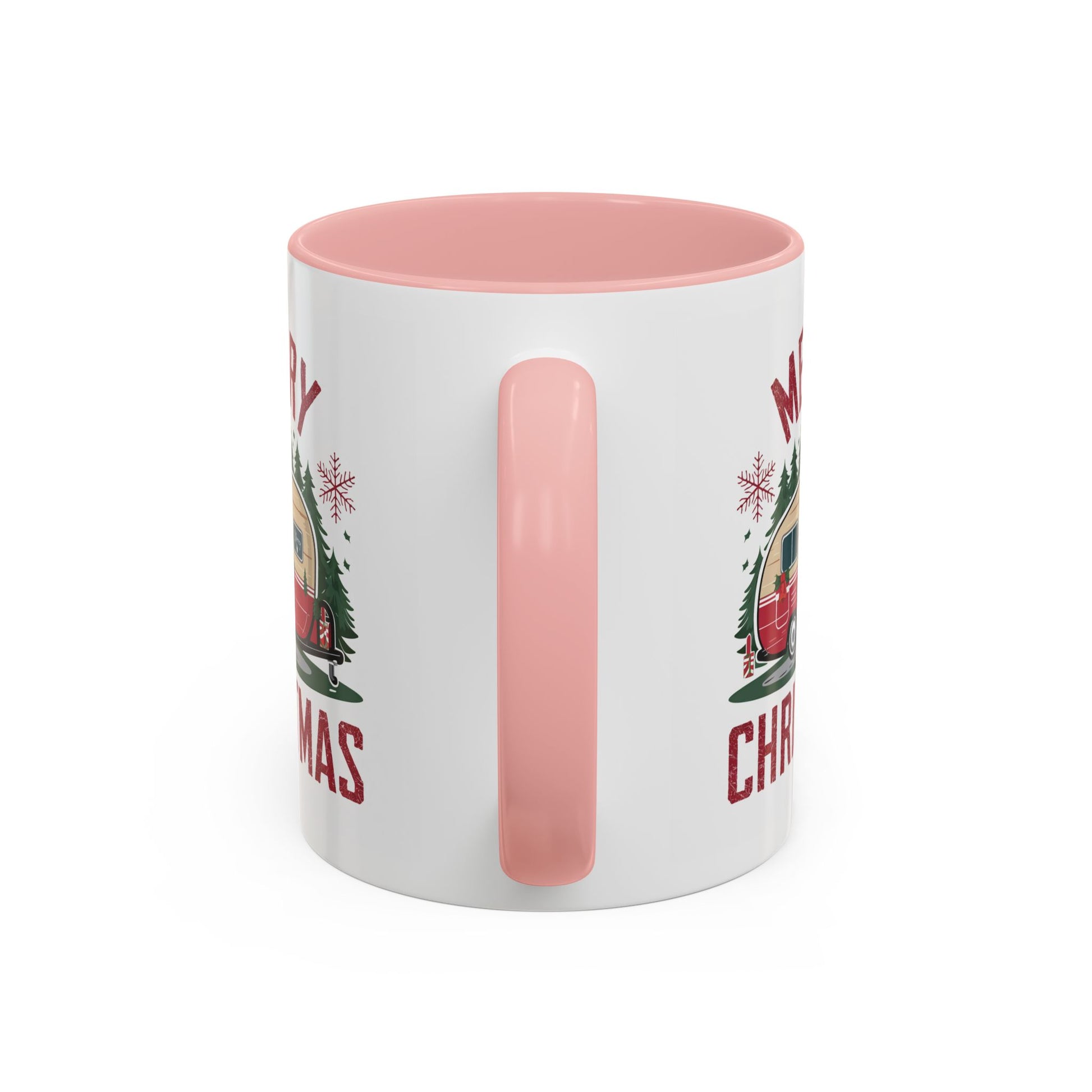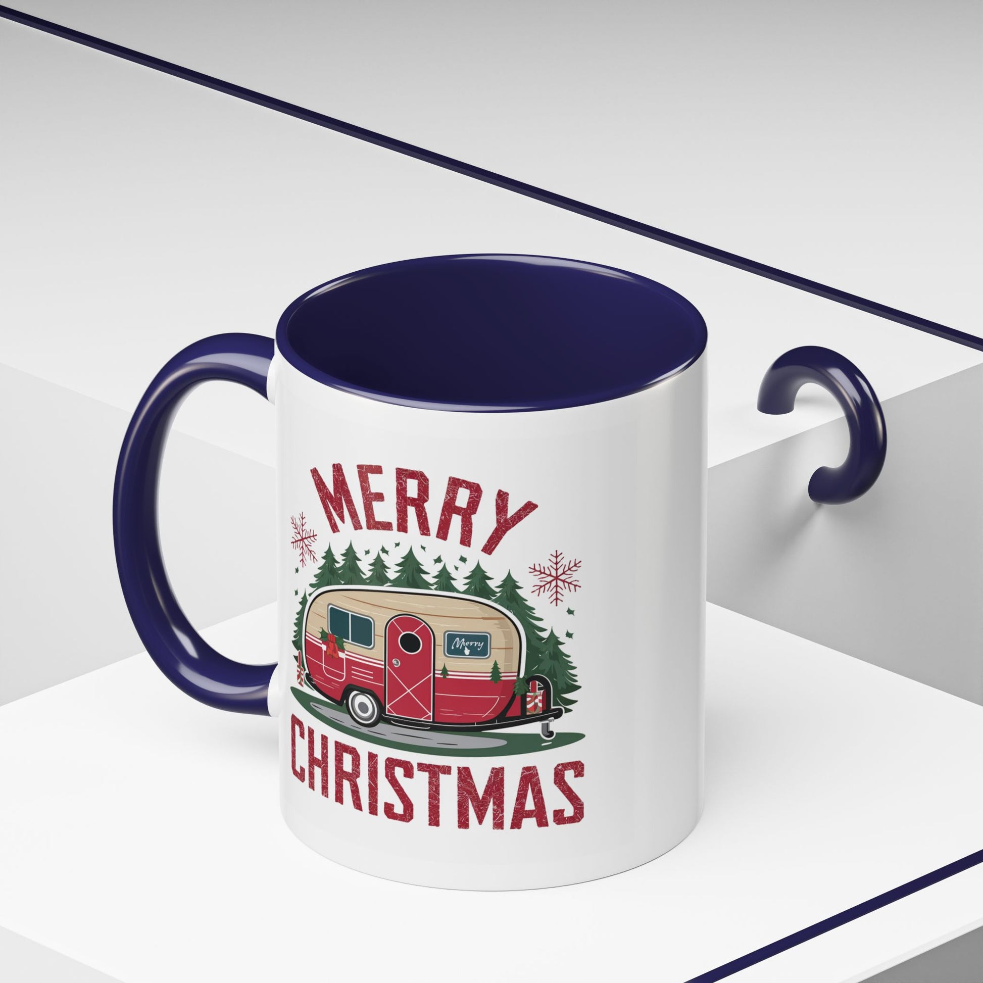 Christmas Mug - Merry Christmas Maroon Text Camper Trees Snowflakes