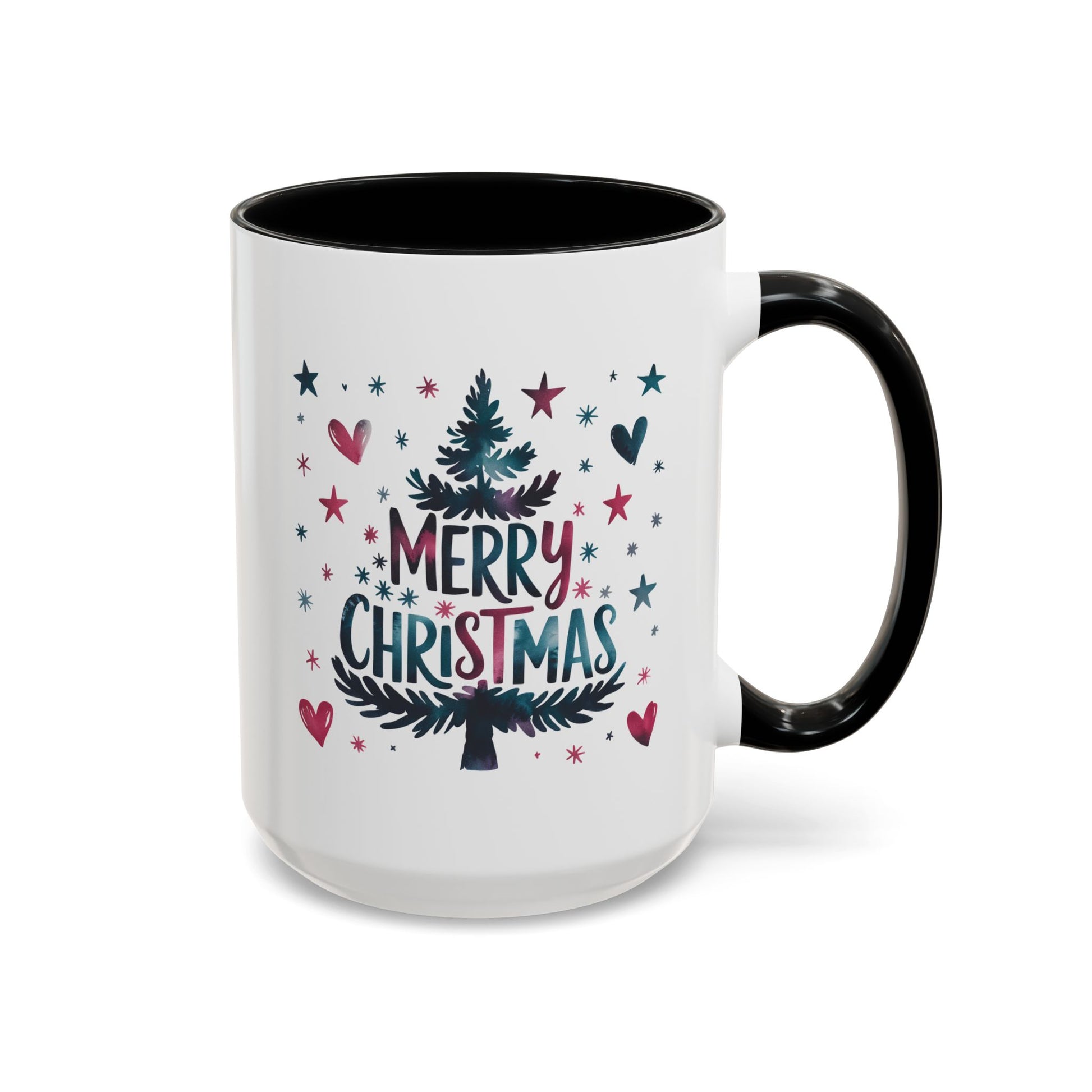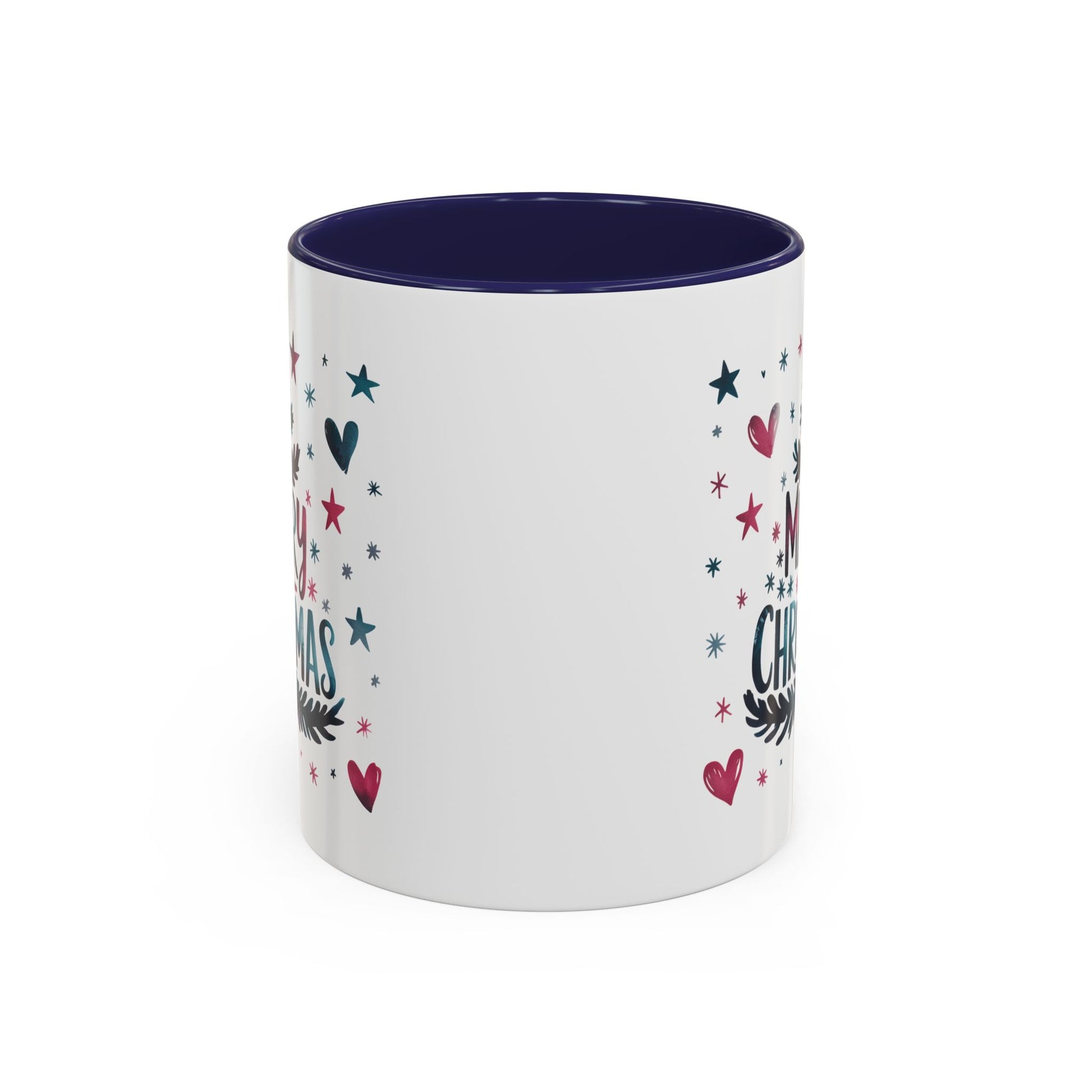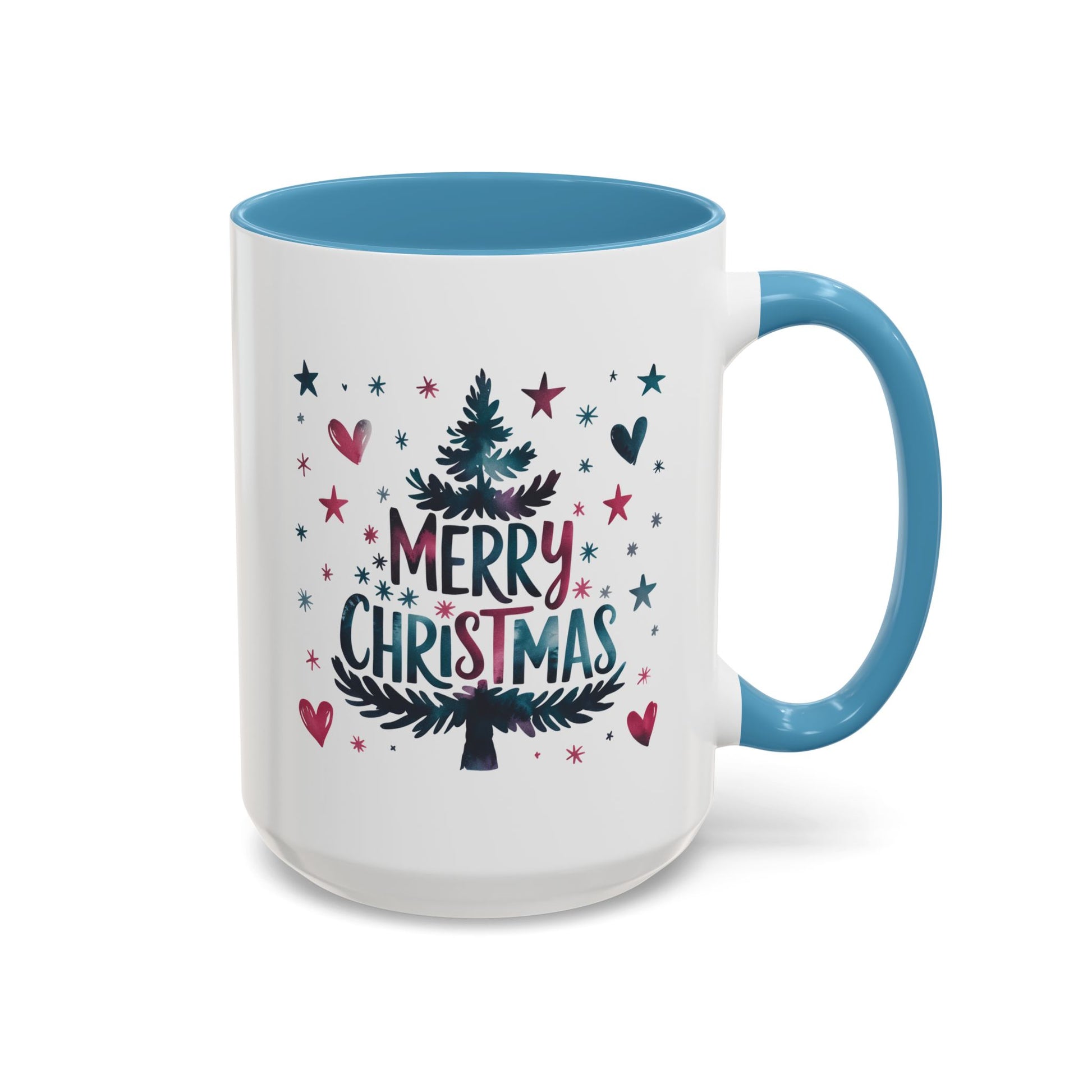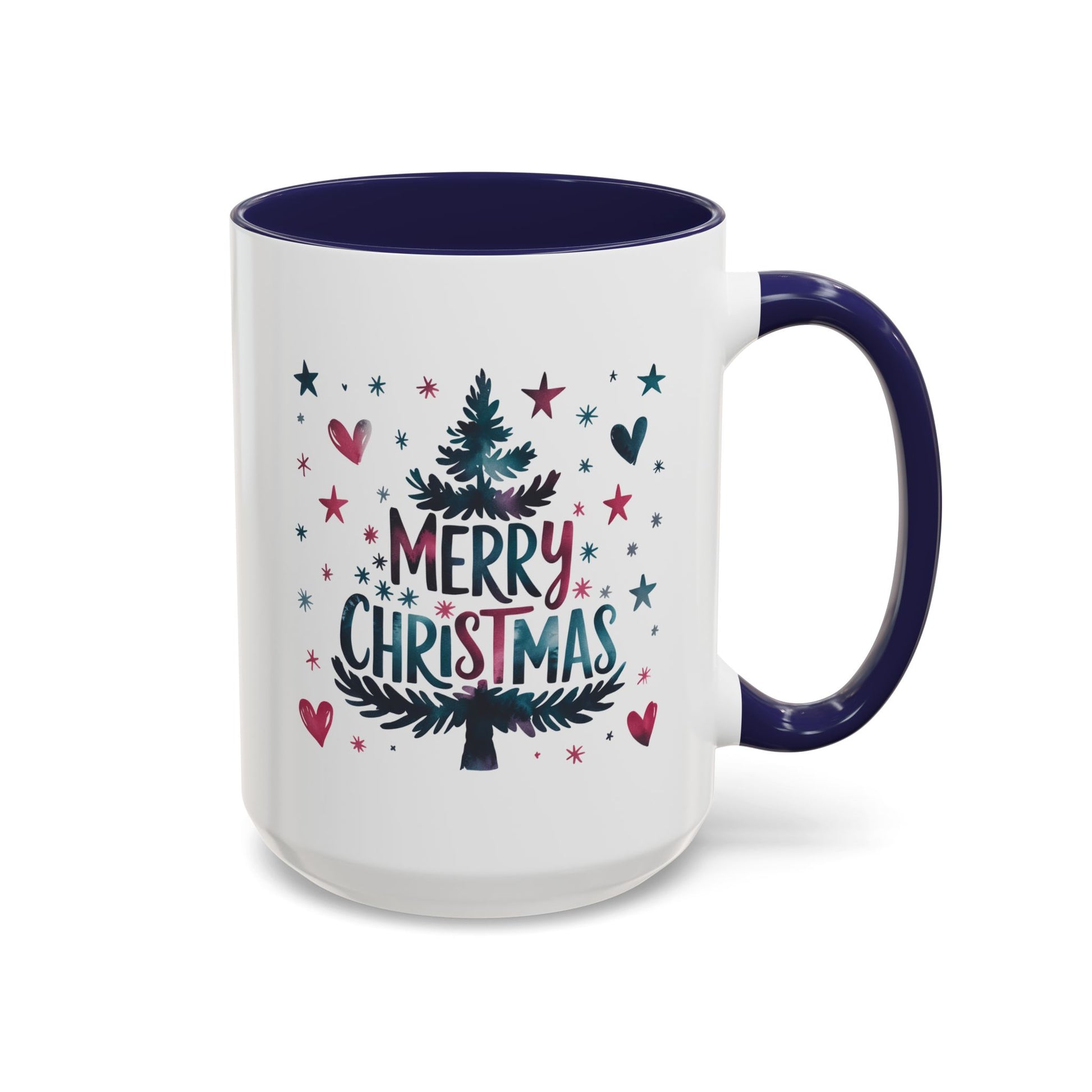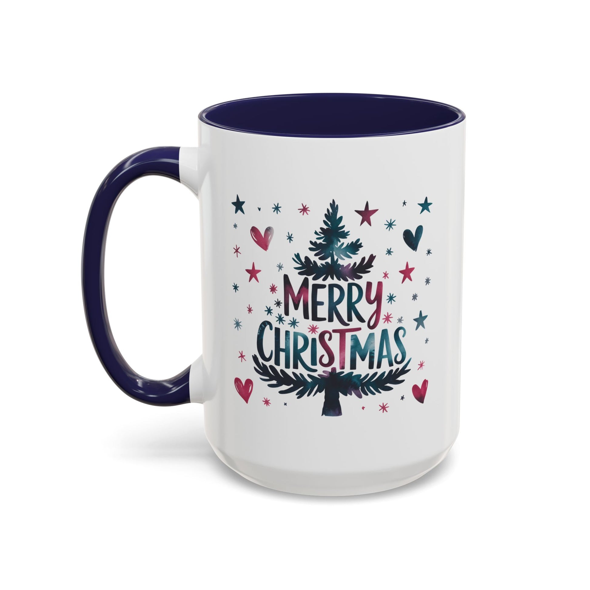 Christmas Mug - Merry Christmas Maroon & Blue Text Tree Hearts Stars