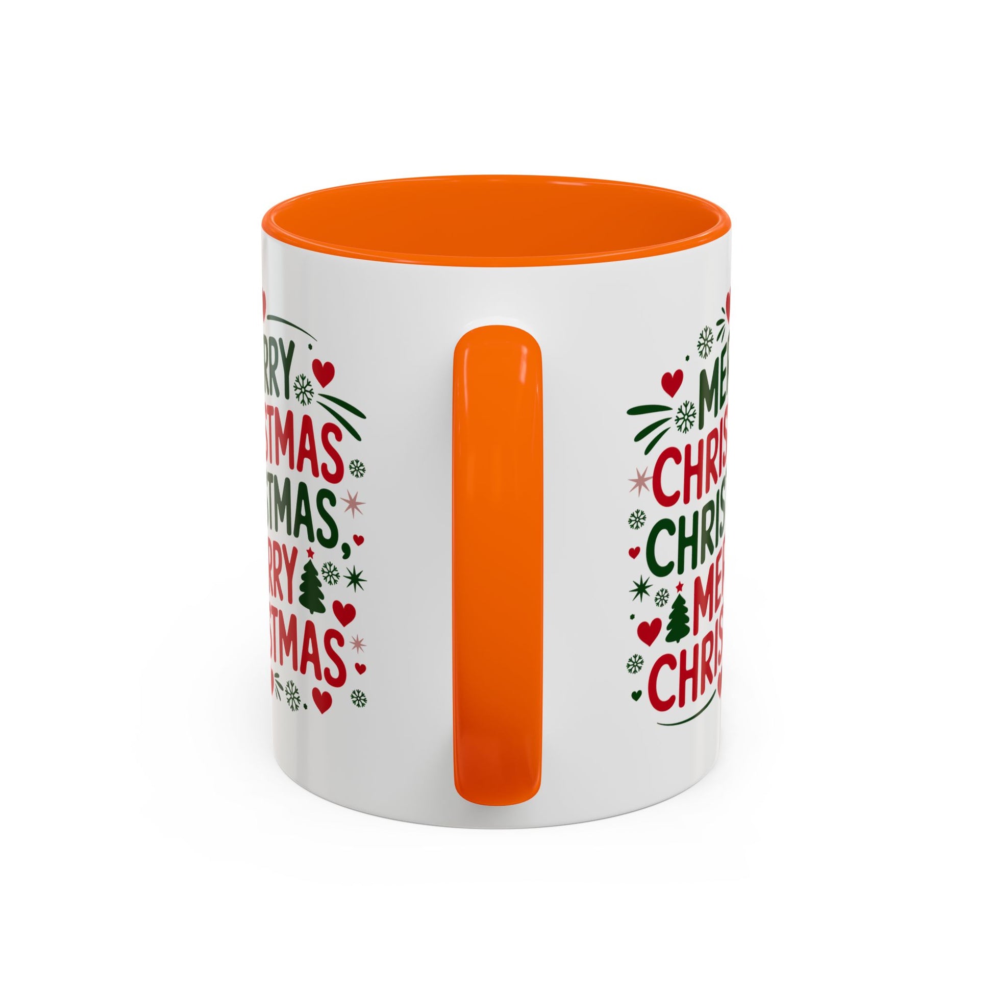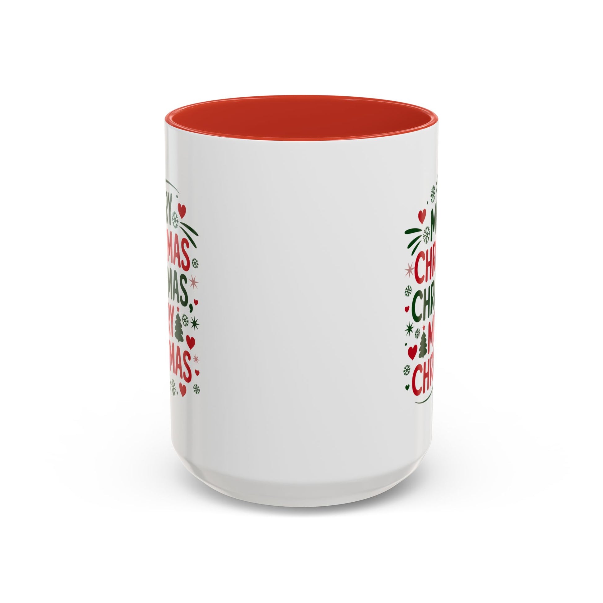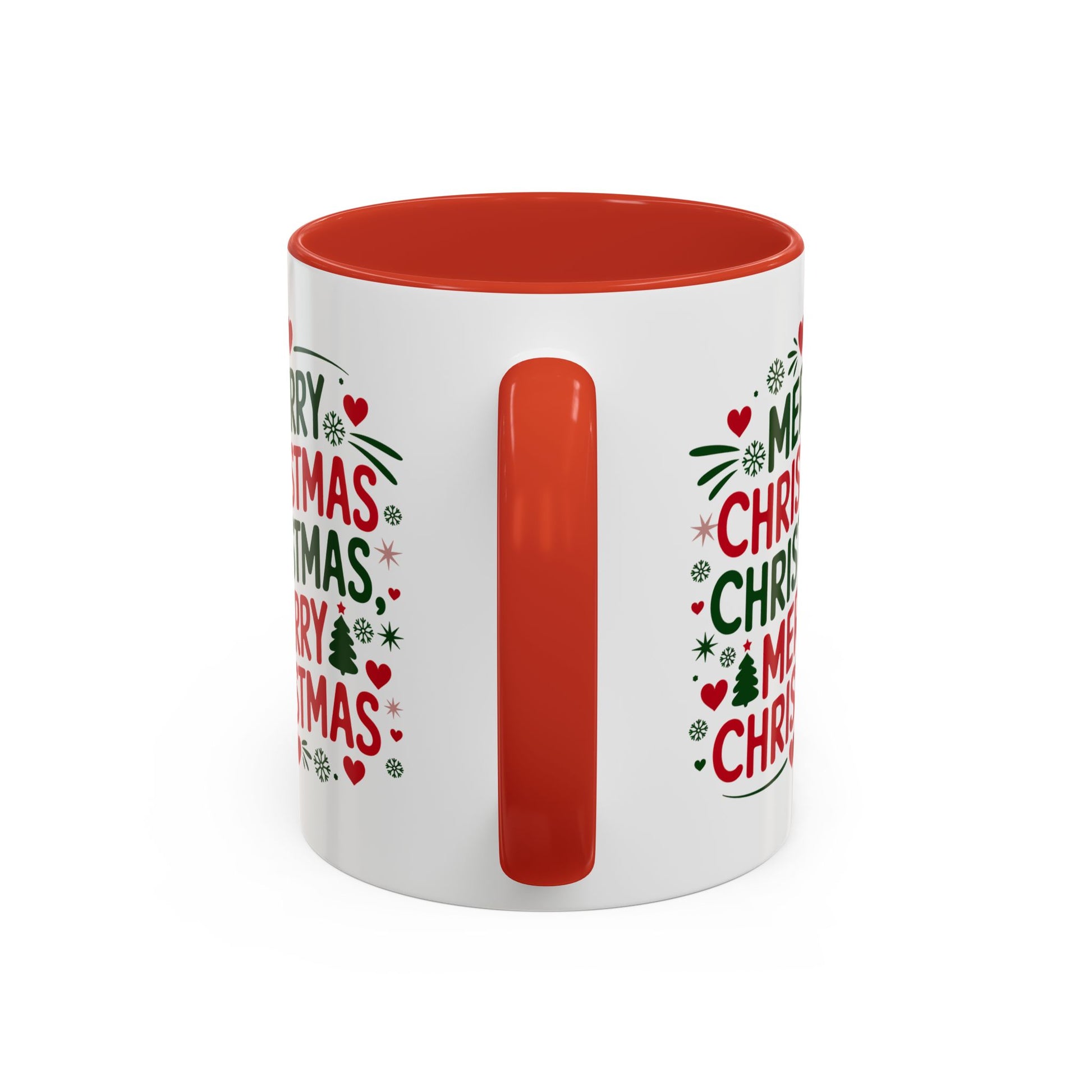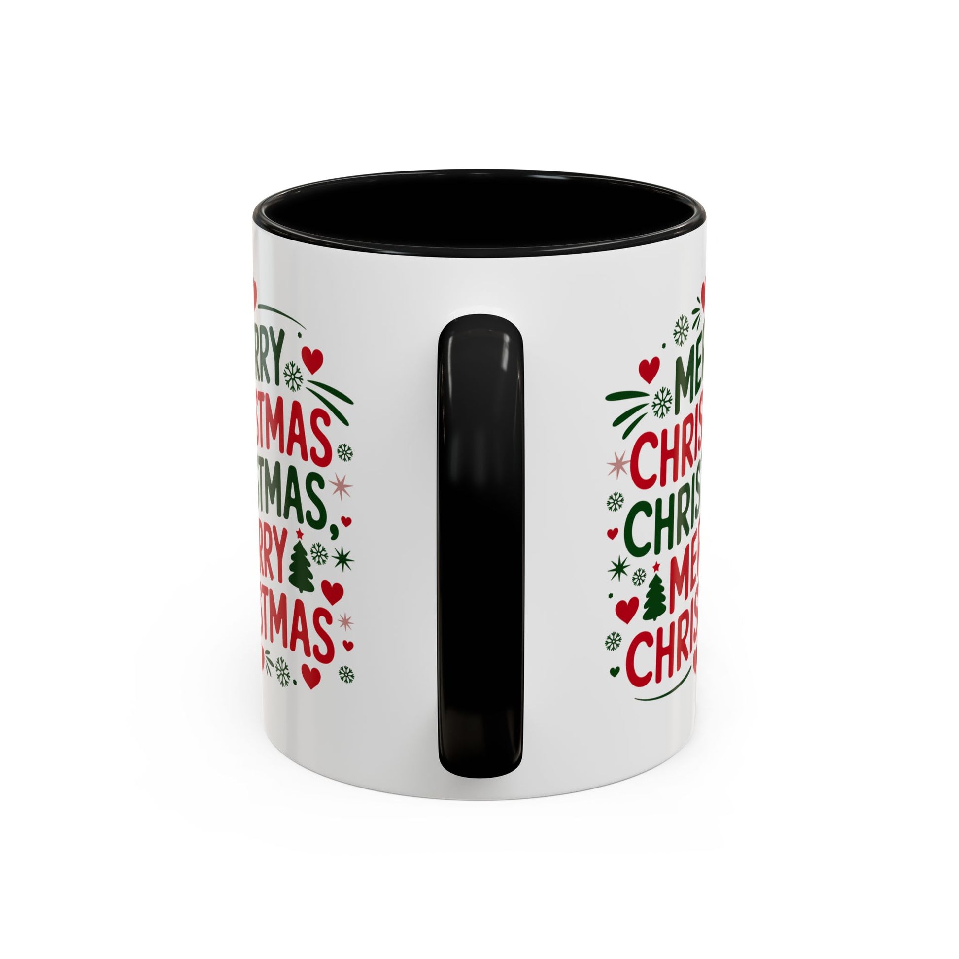 Christmas Mug - Merry Christmas Green & Red Text Trees Hearts Snowflakes Stars