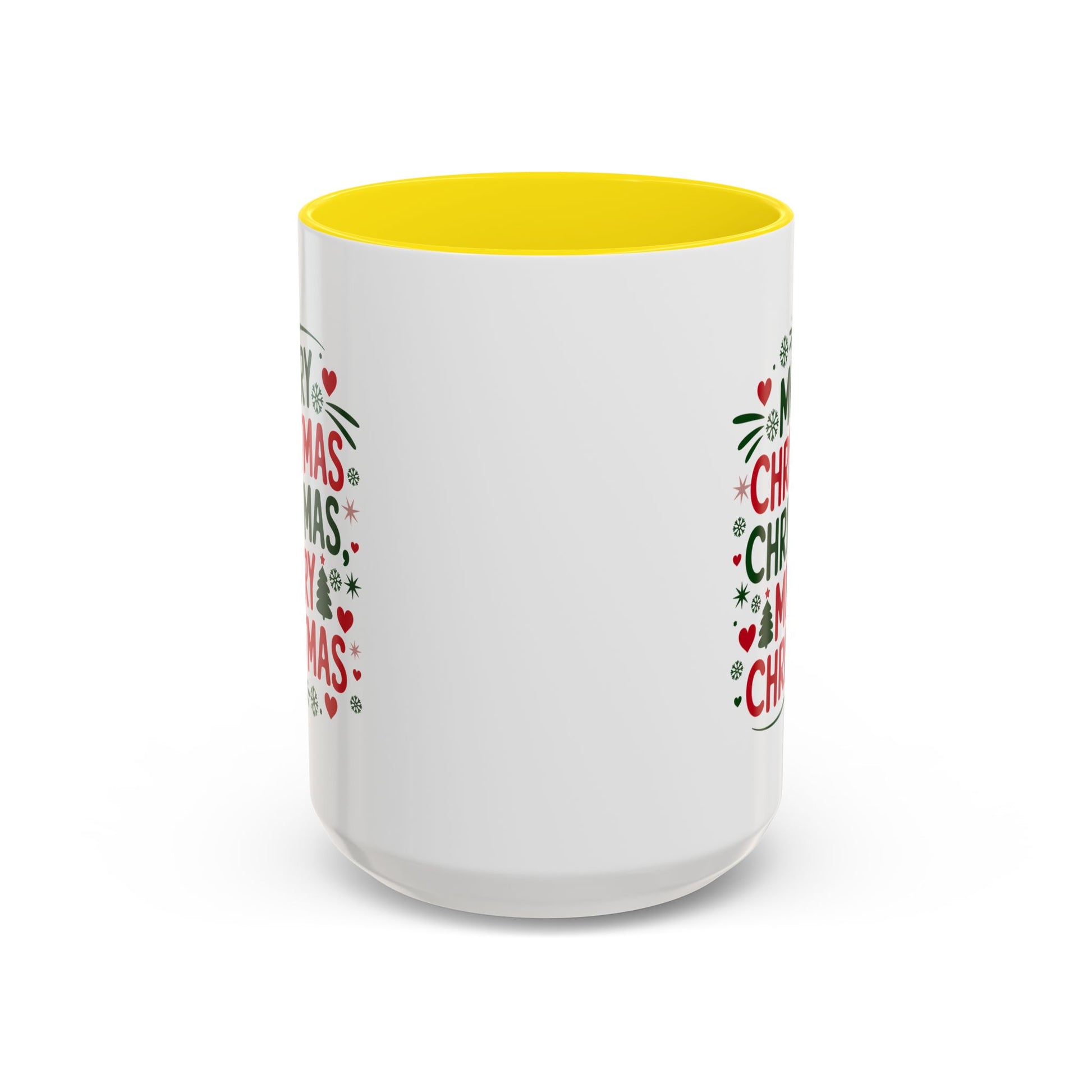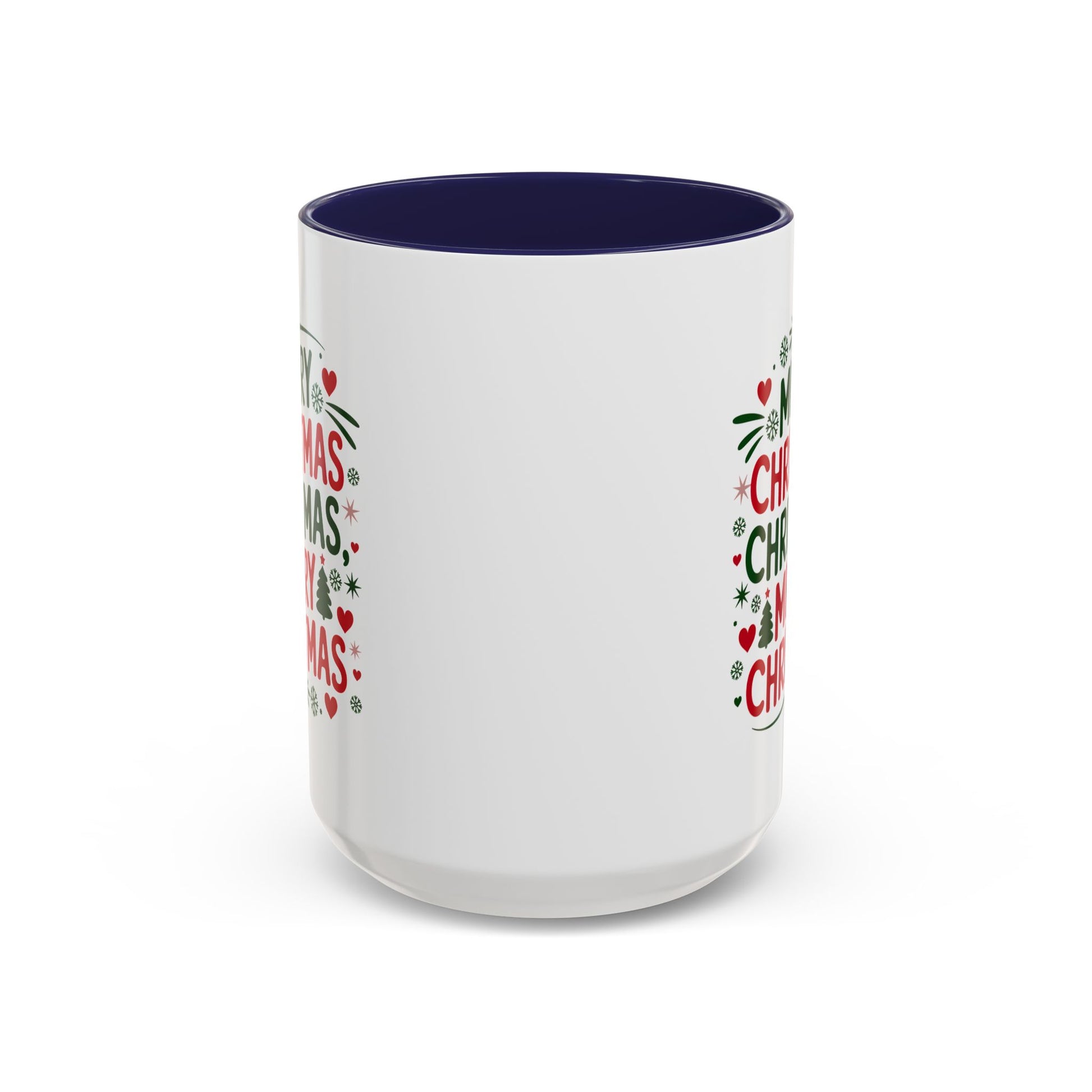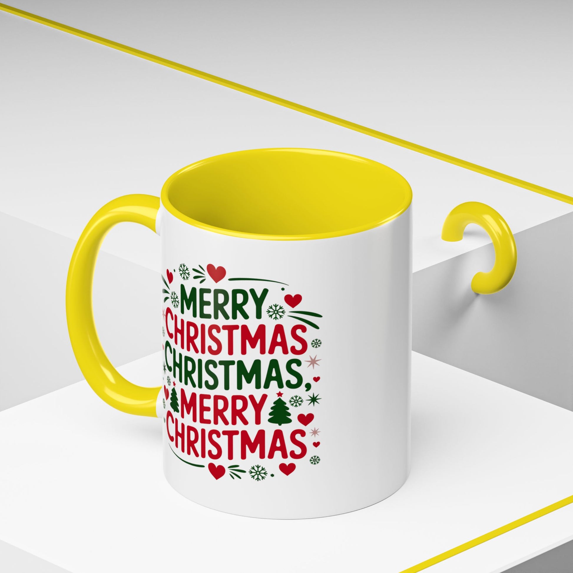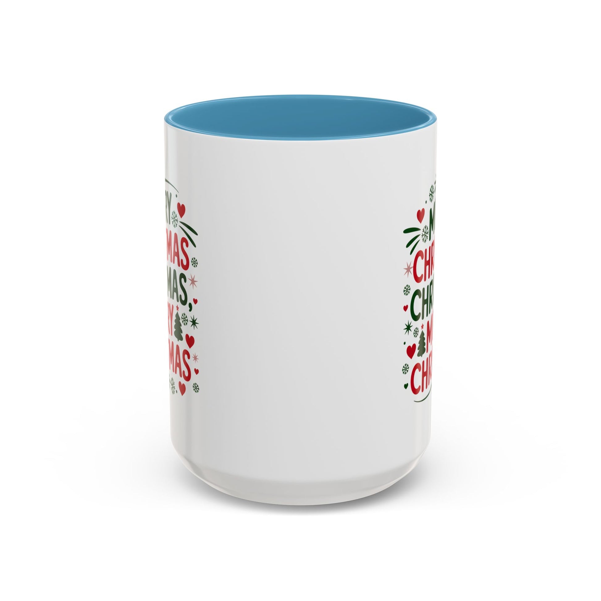 Christmas Mug - Merry Christmas Green & Red Text Trees Hearts Snowflakes Stars